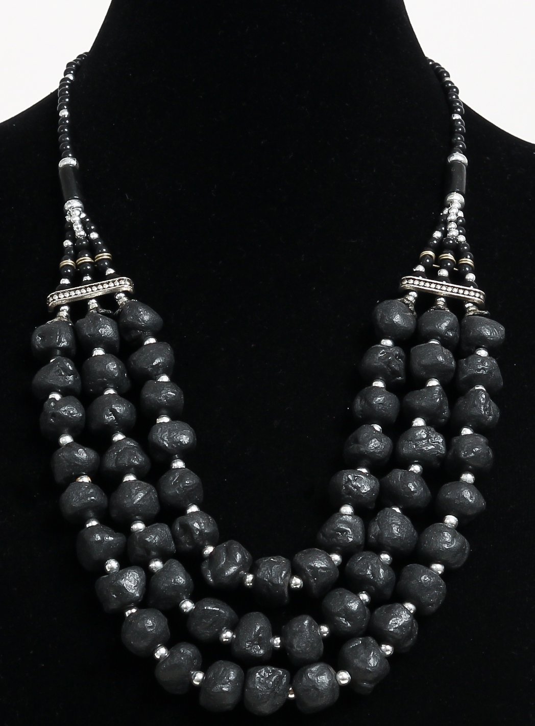 Collier ethnique artisanal trois rangs imitation pierres noires et perles agencées de pièces argentées ciselées Vetement & Accessoire