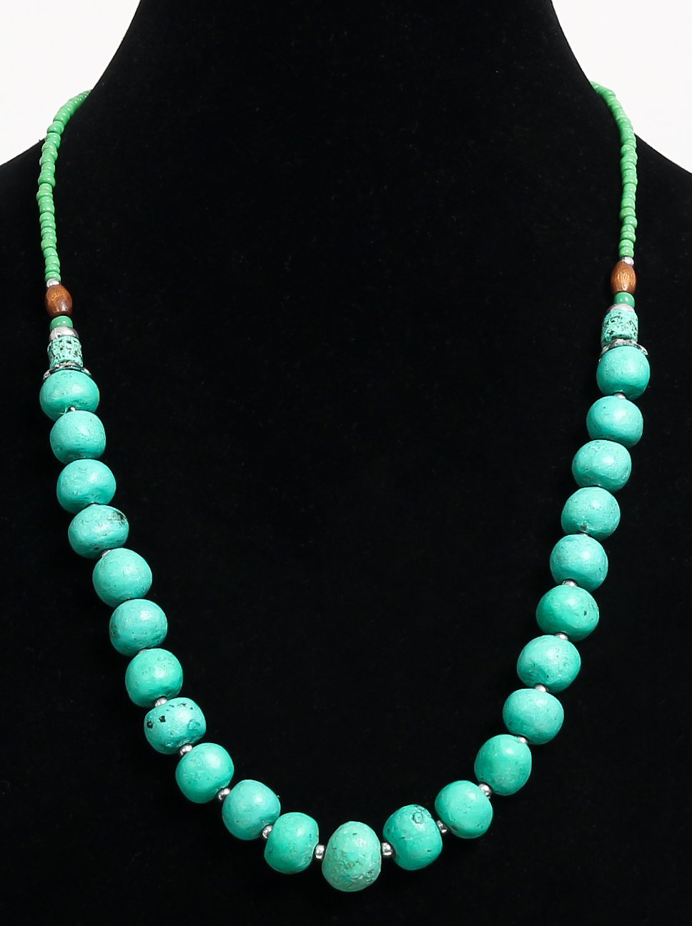 Collier ethnique artisanal imitation pierres rondes turquoises agencées de perles argentées, vertes et en bois Vetement & Accessoire