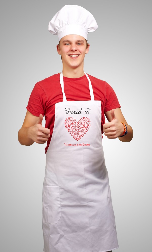 Un tablier personnalisé selon votre goût vous protégera de toute sorte de tâches. Le tablier est lessivable en machine à 40° ; les couleurs ne déteignent pas avec le temps.