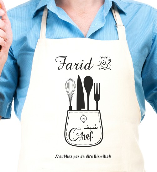 Recevez ce joli tablier de cuisine (mixte) avec inscription de votre choix (prénom, message, etc.) et une jolie illustration avec inscription Chef en français et en arabe.