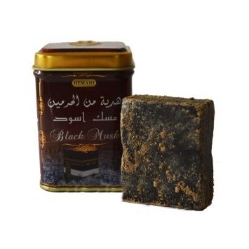 Boite métallique contenant du musc noirs solide (en morceau). Le parfum musc noir est un parfum solide, produit à base d'huiles essentielles sans alcool.