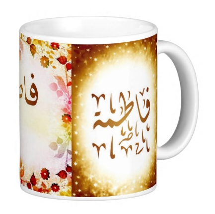 Mug avec le prénom "Fatma" écrit en français, en arabe (فاطمة) et calligraphié de façon artistique en arabe sur la partie droite.
