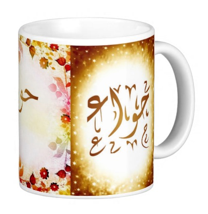Mug avec le prénom "Hawa" écrit en français, en arabe (حواء) et calligraphié de façon artistique en arabe sur la partie droite.