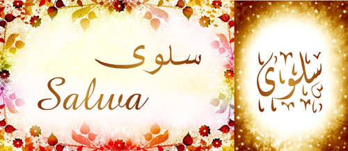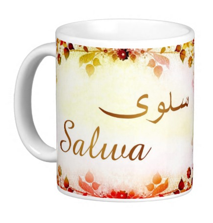Mug avec le prénom "Salwa" écrit en français, en arabe (سلوى) et calligraphié de façon artistique en arabe sur la partie droite.