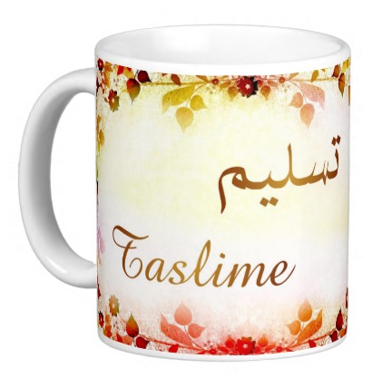 Mug avec le prénom "Taslime" écrit en français, en arabe (تسليم) et calligraphié de façon artistique en arabe sur la partie droite.