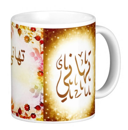 Mug avec le prénom "Tahani" écrit en français, en arabe (تهاني) et calligraphié de façon artistique en arabe sur la partie droite.