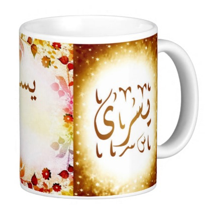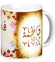 Mug avec le prénom "Yousra" écrit en français, en arabe (يسرى) et calligraphié de façon artistique en arabe sur la partie droite.