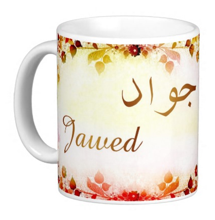 Mug avec le prénom "Jawed" écrit en français, en arabe (جواد) et calligraphié de façon artistique en arabe sur la partie droite.