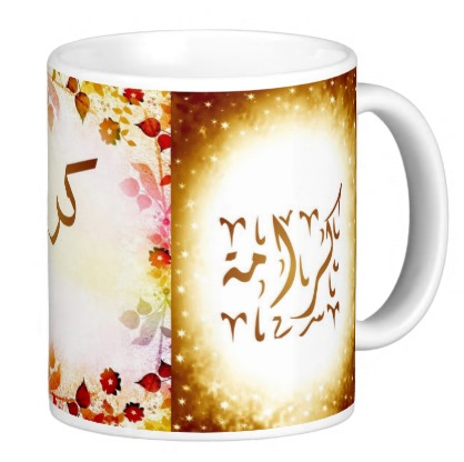 Mug avec le prénom "Karama" écrit en français, en arabe (كرامة) et calligraphié de façon artistique en arabe sur la partie droite.