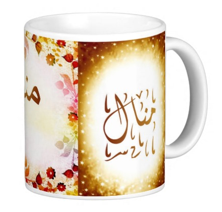 Mug avec le prénom "Menel" écrit en français, en arabe (منال) et calligraphié de façon artistique en arabe sur la partie droite.