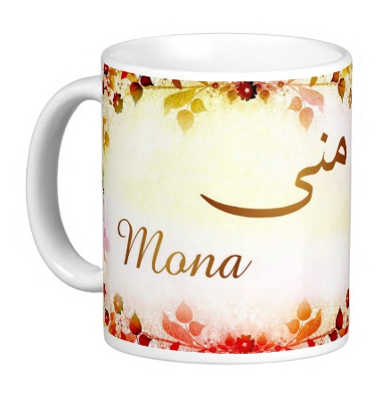 Mug avec le prénom "Mona" écrit en français, en arabe (منى) et calligraphié de façon artistique en arabe sur la partie droite.