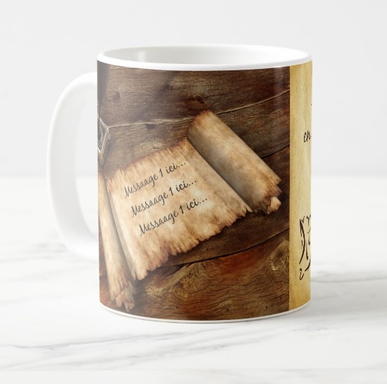 Mug arabesque avec deux messages personnalisés (Tasse beige et marron) - REF. 36851 (9.90 €)