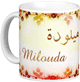 Mug avec le prénom "Nazha" écrit en français, en arabe (نزهة) et calligraphié de façon artistique en arabe sur la partie droite.