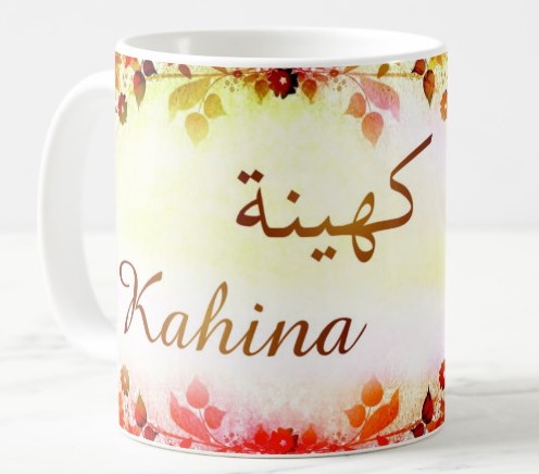 Mug avec le prénom "Kahina" écrit en français, en arabe (كهينة) et calligraphié de façon artistique en arabe sur la partie droite.