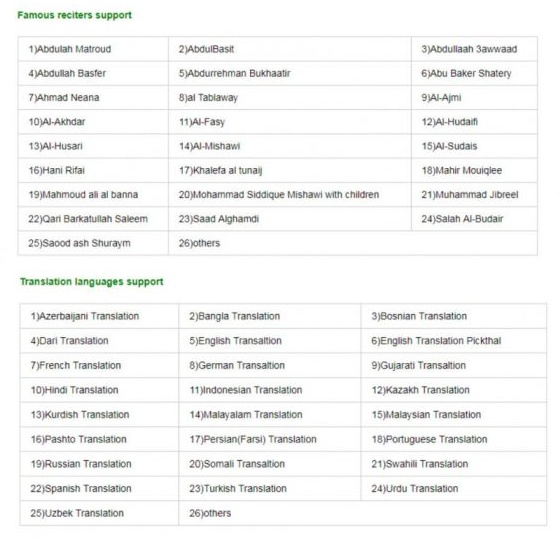 Présente 18 récitations différentes d'Imams connus et 15 langues dont l'anglais, l'arabe, français, espagnol, allemand etc.