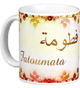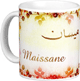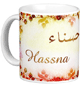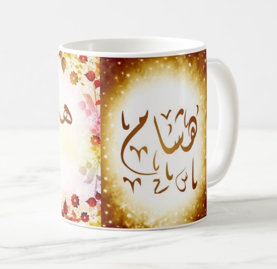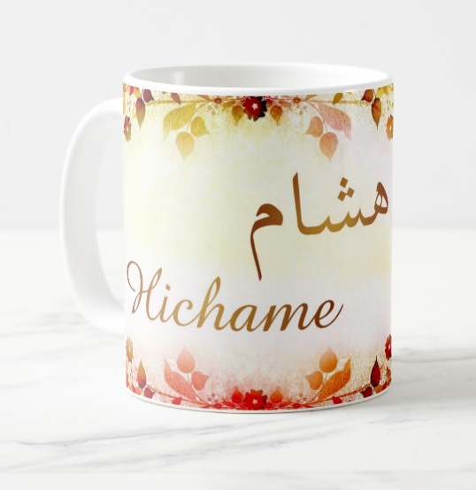 Mug avec le prénom "Hichame" écrit en français, en arabe (هشام) et calligraphié de façon artistique en arabe sur la partie droite.