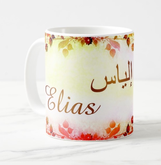 Mug avec le prénom "Elias" écrit en français, en arabe (إلياس) et calligraphié de façon artistique en arabe sur la partie droite.