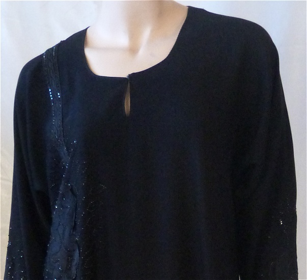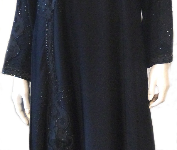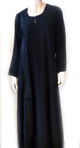 Abaya noire composée de broderies, de strass sur toute la longueur du coté droit. Vous retrouverez ces beaux motifs sur chacune des manches.Foulard assorti.