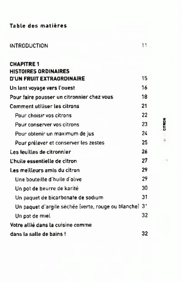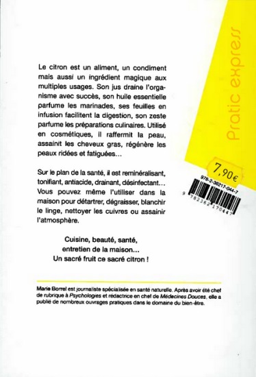 Le citron est un aliment, un condiment mais aussi un ingrédient magique aux multiples usages. Utilisé en cosmétiques, il raffermit la peau, assainit les cheveux gras, régénère les peaux ridées et fatiguées… Sur le plan de la santé, il est reminéralisant, tonifiant, anti-acide, fébrifuge, désinfectant… Côté maison, il n’a pas son pareil pour détartrer, dégraisser, blanchir le linge, nettoyer les cuivres ou désinfecter l’atmosphère… Ce petit livre pratique propose + de 50 recettes de cuisine, de beauté et de santé ainsi que de nombreux remèdes naturels pour l’entretien de la maison.