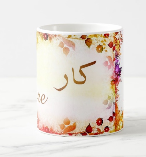 Mug avec le prénom Care calligraphié en arabe ainsi que son écriture normale en arabe (كار) et en français.