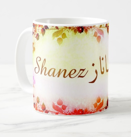 Mug avec le prénom Shanez calligraphié en arabe ainsi que son écriture normale en arabe (شاناز) et en français.