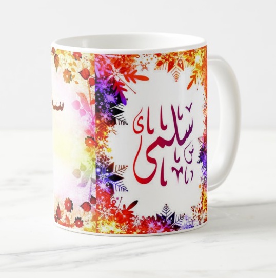 Mug avec le prénom Selma calligraphié en arabe ainsi que son écriture normale en arabe (سلمى) et en français.