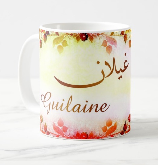 Mug avec le prénom Guilaine calligraphié en arabe ainsi que son écriture normale en arabe (غيلان) et en français.