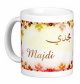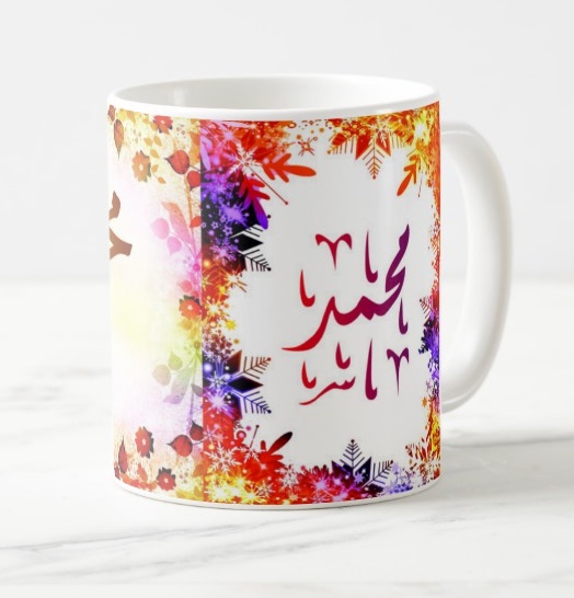 Mug avec le prénom Mohamed calligraphié en arabe ainsi que son écriture normale en arabe (محمد) et en français.