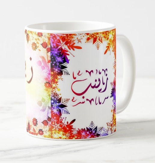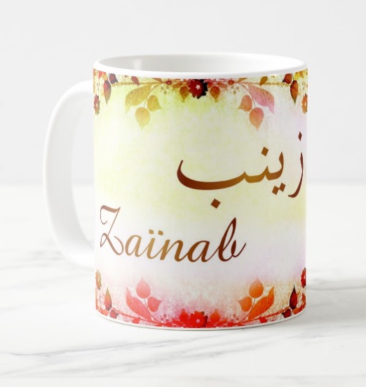 Mug avec le prénom Zaïnab calligraphié en arabe ainsi que son écriture normale en arabe (زينب) et en français.