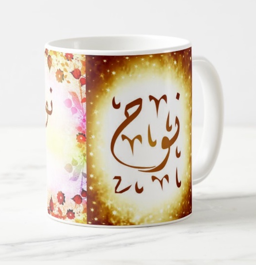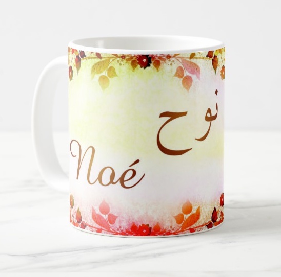 Mug avec le prénom Noé calligraphié en arabe ainsi que son écriture normale en arabe (نوح) et en français.