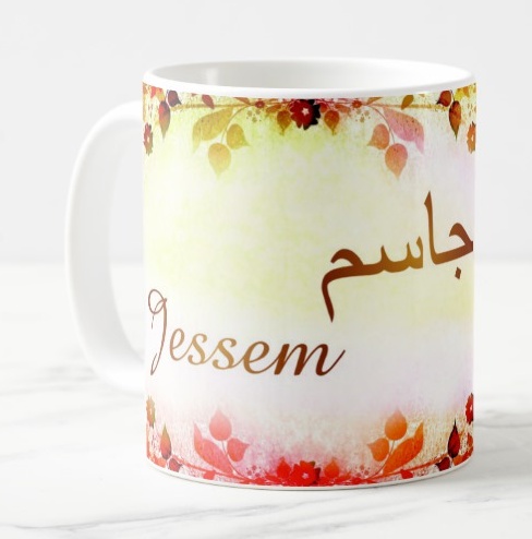 Mug avec le prénom Jessem calligraphié en arabe ainsi que son écriture normale en arabe (جاسم) et en français.
