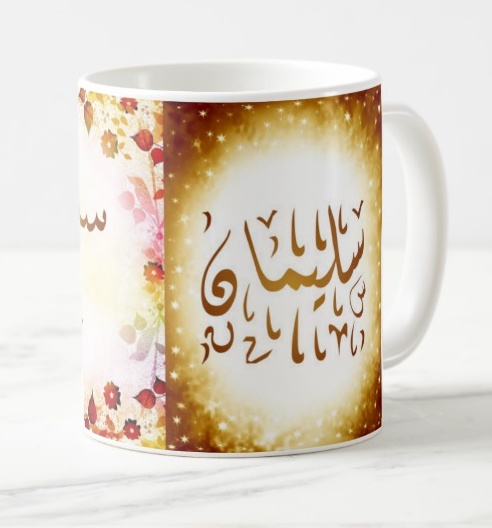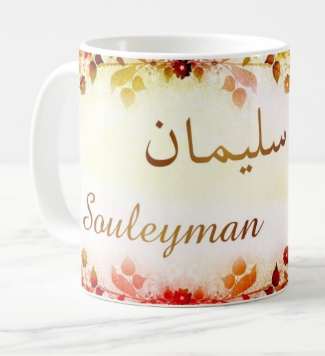 Mug avec le prénom Souleyman calligraphié en arabe ainsi que son écriture normale en arabe (سليمان) et en français.