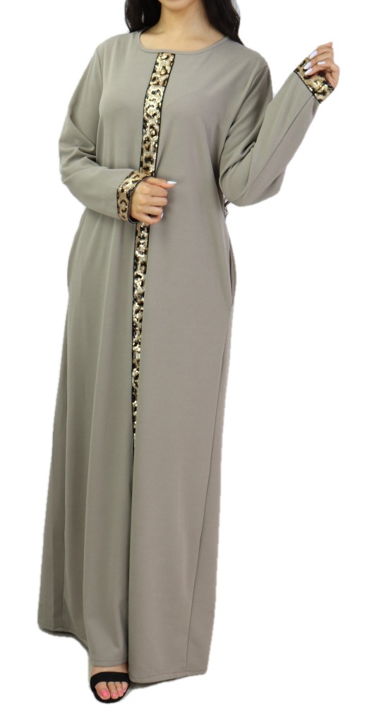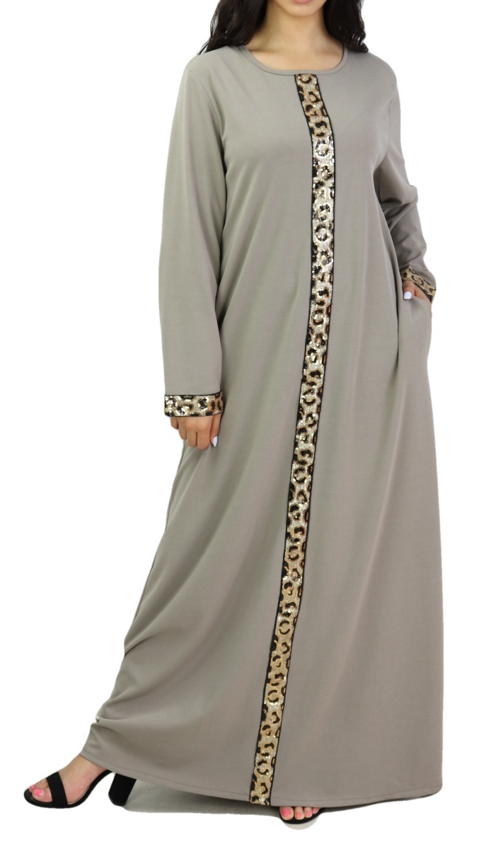 Très jolie robe longue avec strass dorés, argentés et noirs au niveau de l'avant et des manches. Deux poches sur les côtés. Tissu assez épais non transparent.
