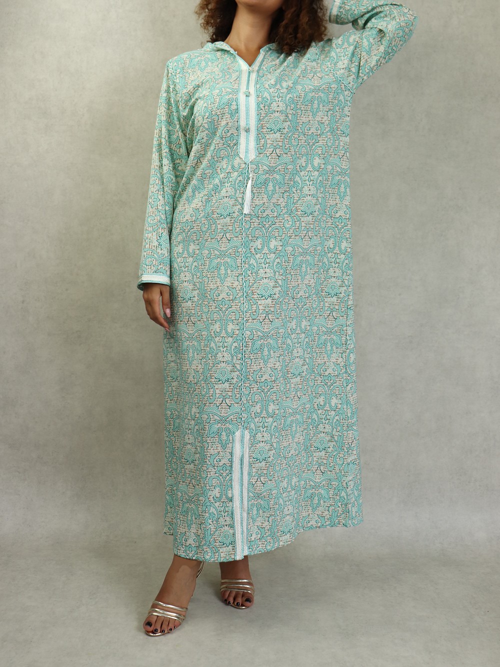 Robe longue, col en V, Manches longues, fluide et légère à fleurs, avec un liseré autour de la capuche, manches et ainsi sur le buste.