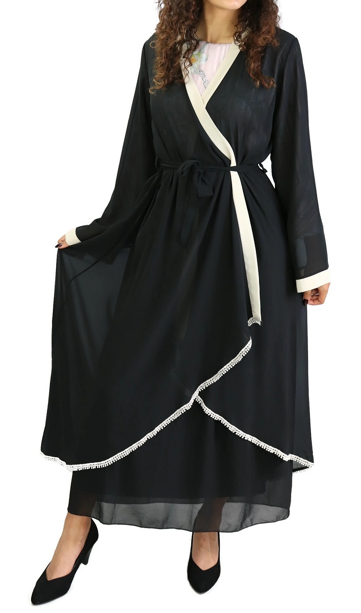 Robe de soirée style Abaya Dubaï noire ouverte de qualité avec broderie et strass et ceinture interne - REF. 38191 (49.00 €)