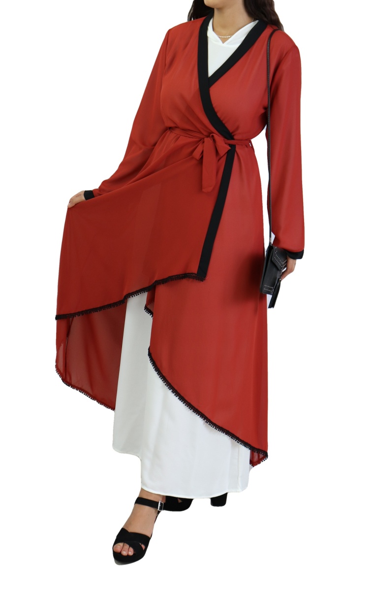 Kimono croisé avec bordures noires et dentelle. Longueur plus importante à l'arrière.