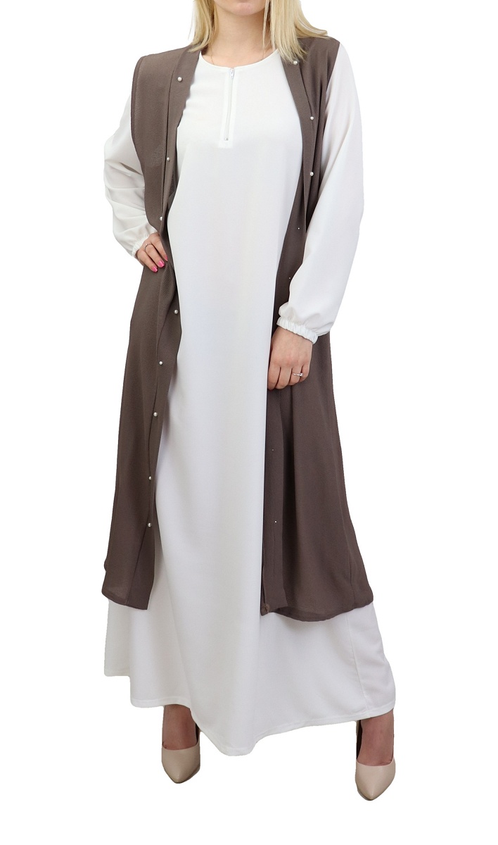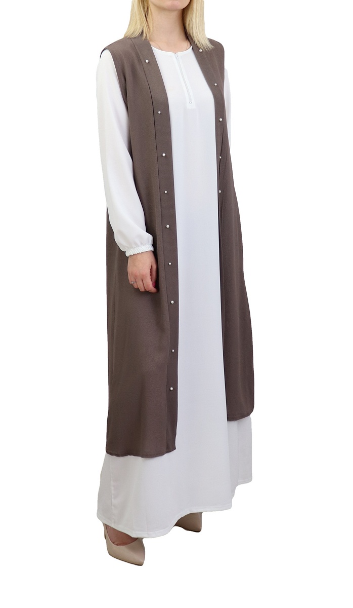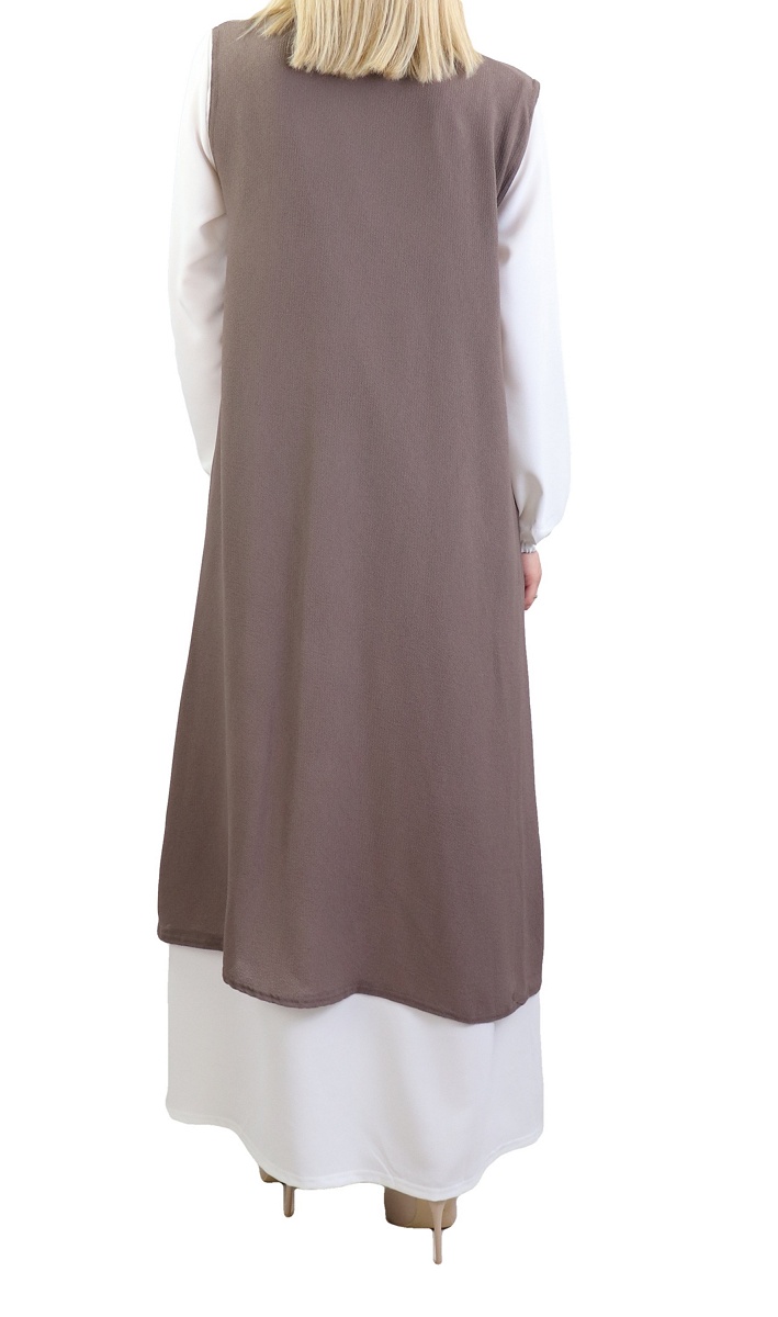 Gilet long, sans manche, décoration perlée, tissu fluide, effet crêpe.