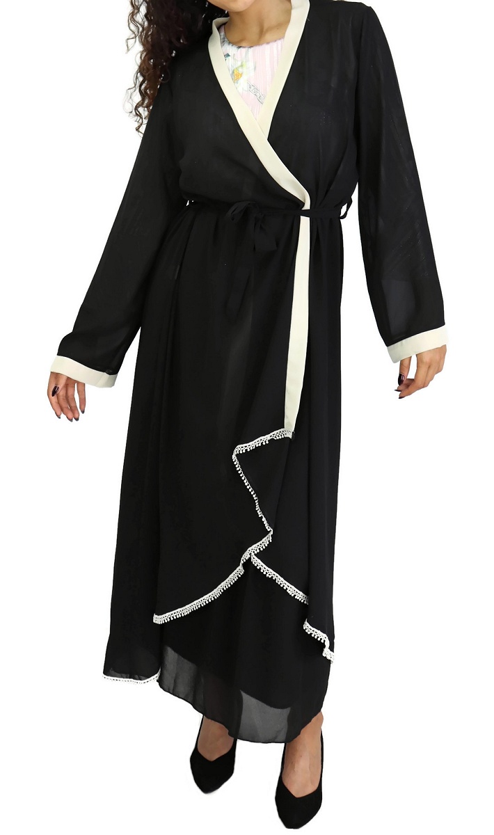 Kimono croisé avec bordures noires et dentelle. Longueur plus importante à l'arrière.