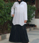 Tunique ample col rond, toutes saisons, plissée au niveau des manches et du bas. Bandes noires tressées pailletées. Tissu opaque.