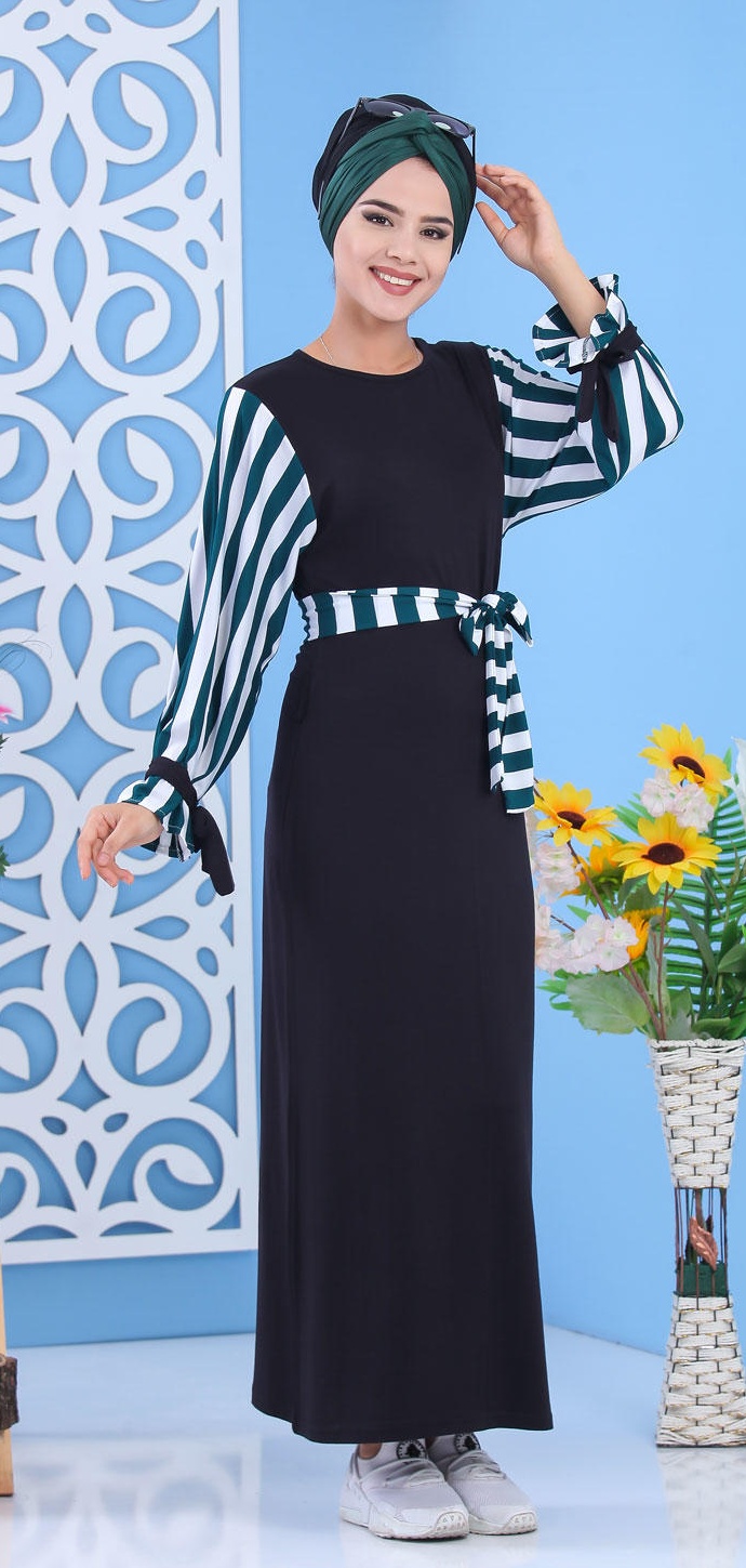 Robe longue noire , coupe droite, col rond, manches à rayures avec finition lien de serrage aux poignets, le tout accommodé d'une ceinture amovible. Optez pour cette tenue chic et tendance avec ses petits détails qui font la différence.