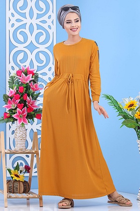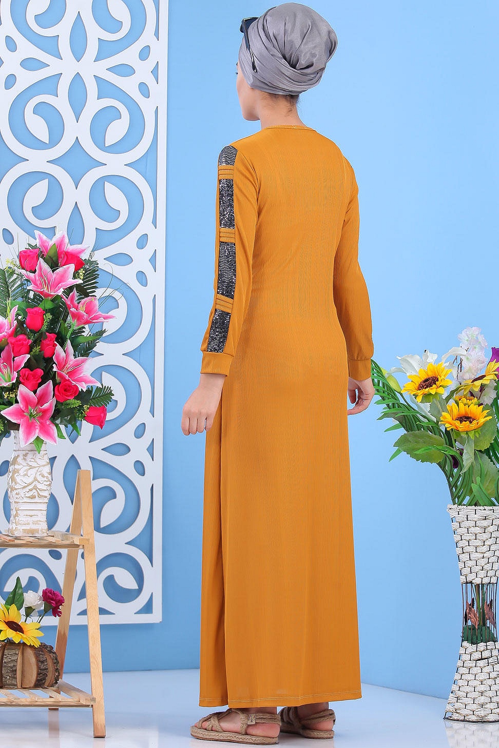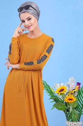 Robe longue, col rond, manches décorées de strass sur toute la longueur, taille à ajuster avec un lien de serrage, 2 poches sur les cotés, tissu effet strié. Cette robe sera parfaite pour diverses occasions avec sa touche scintillante, à vous de l'associer avec l'accessoire qui fera le petit "plus".