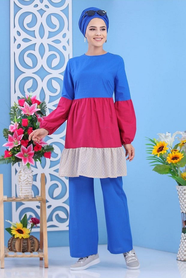 Ensemble 2 pièces : Tunique longue, col rond fermeture bouton, manches légèrement bouffantes, volants, coupe évasée ; et son pantalon assorti ample, coupe droite, taille élastique. Mélange de matières. Cet ensemble sobre et élégant n'a besoin de rien d'autre pour être mis en valeur.