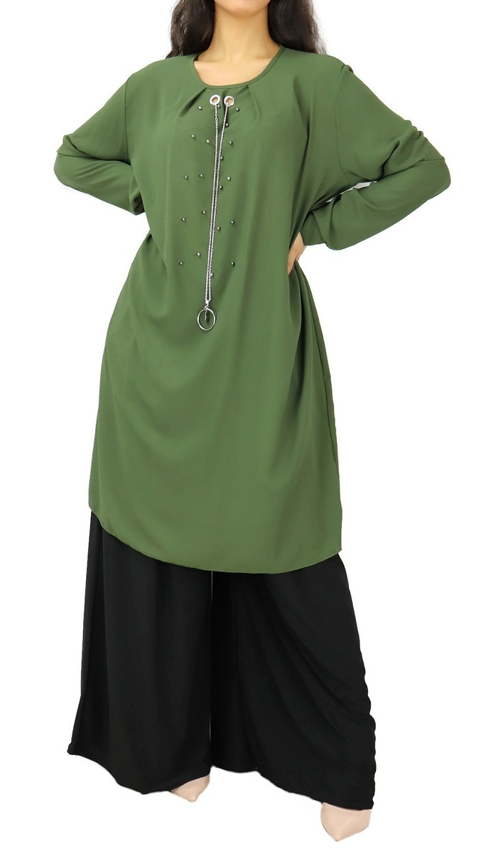 Tunique longue coupe évasée, tissu crêpe fluide, col rond, manches longues, est ornée de perles à l'avant et le tout accompagné d'un collier argenté avec un bijoux en pendentif, cette pièce sort du lot et se démarque des autres tuniques. Vous pouvez la porter avec tous types de bas.
