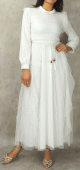 Robe maxi-longue, dentelle en haut et légèrement plissée a la taille. On craque tout simplement ! Encolure arrondi, fermeture à glissière au dos, manches longues finition boutons aux poignets.