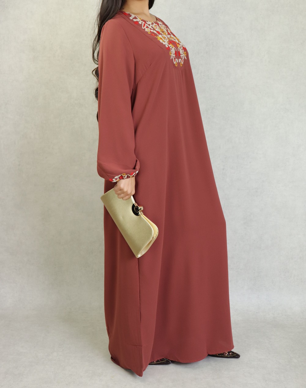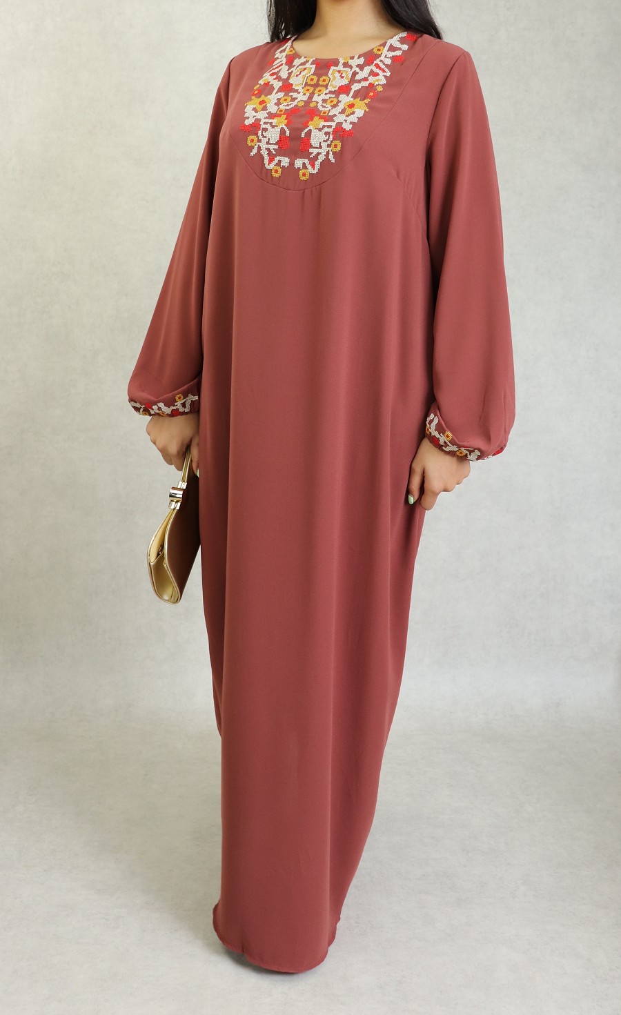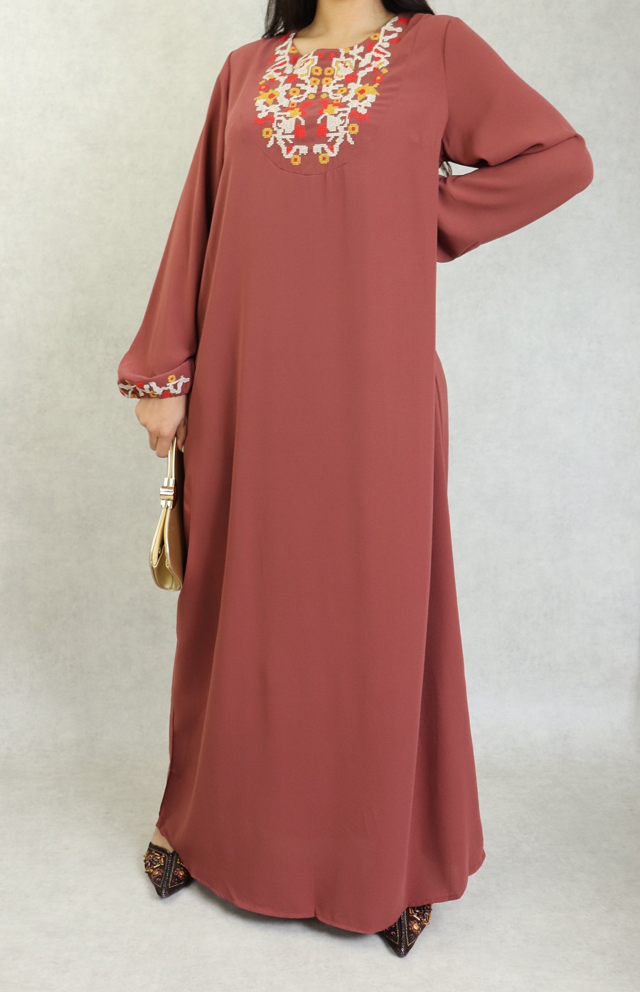Robe longue, col rond, brodé sur le buste ainsi que sur les manches bouffantes élastique au poignets. Cette robe par sa broderie originale vous apportera un supplément d'élégance.