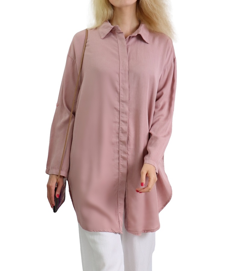 Chemise longue, manches ajustables, fermeture boutonnage caché, deux poches latérales, tissu doux, coupe droite.