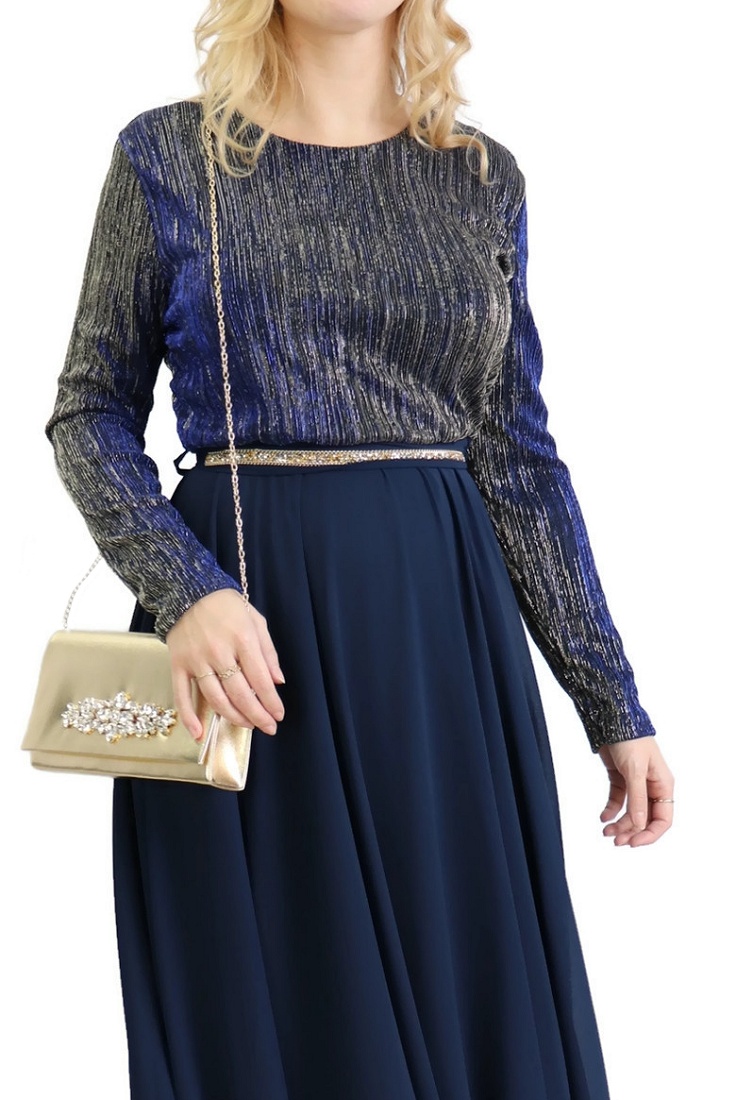 Robe de soirée maxi-longue haut brillant à manches longues - Couleur Bleu marine Vetement & Accessoire