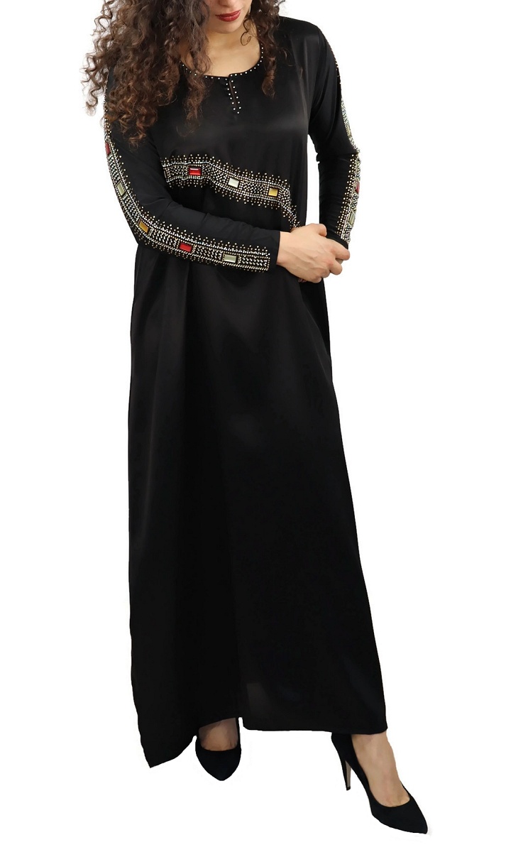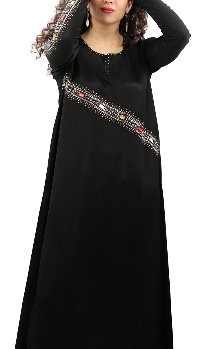 Abaya noire agrémentée de strass et rubis rouges jaunes blanc et dorés sur le devant ainsi que sur toute la longueur des manches.