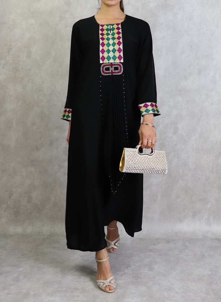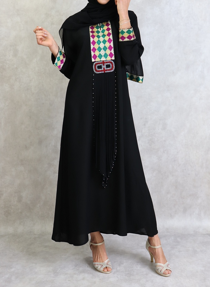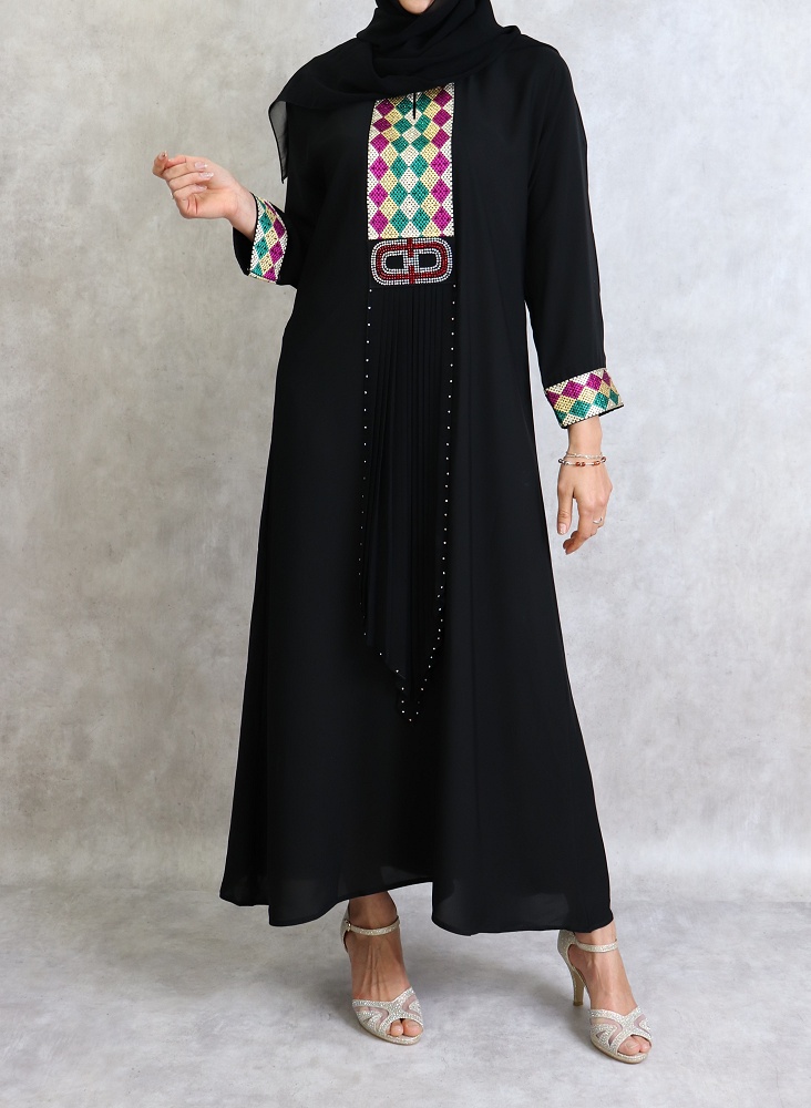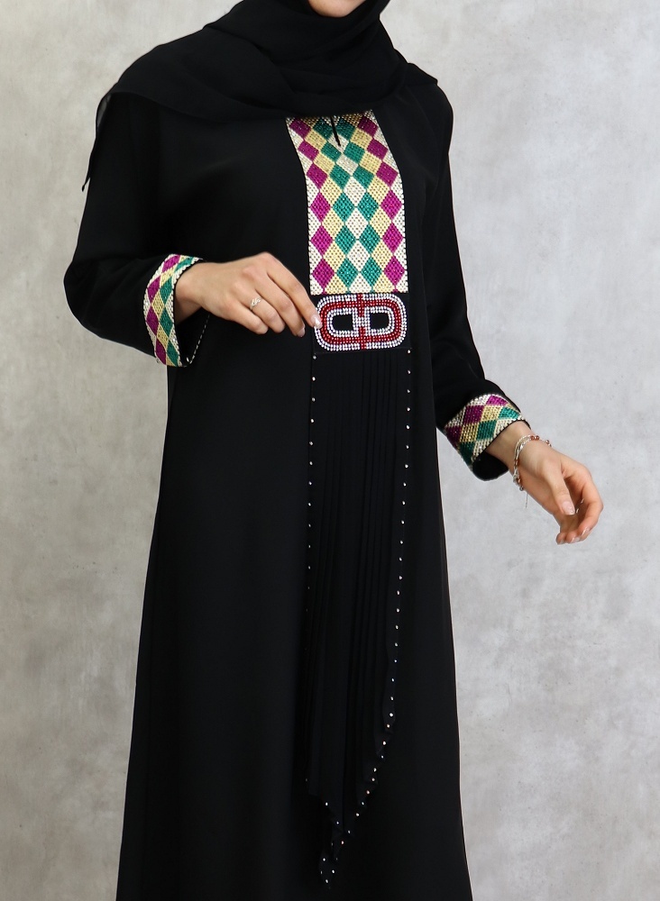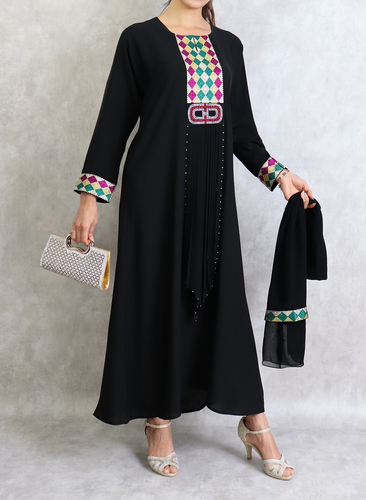 Abaya noire agrémentée de broderies et de strass fuchsia, vert émeraude et doré sur le devant et les manches. Fournie avec une écharpe assortie.