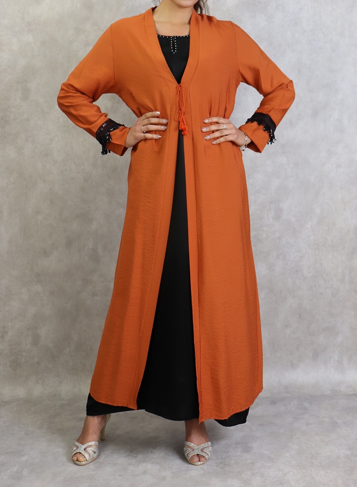 Kimono long Dde couleur rouille avec décorations franges noires Vetement & Accessoire